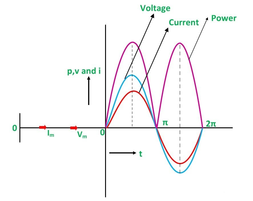 此外,如果我們檢查同一電路的圖形表示,從其功率曲線可以看出,任何時(shí)候功率周期的任何部分都不會變?yōu)樨?fù)。因此,在純電阻電路中,功率永遠(yuǎn)不會為零。此外,這是由于電流和電壓的瞬時(shí)值始終為負(fù)或正。同樣,純電阻電路的功率循環(huán)頻率是電流和電壓波頻率的兩倍。
