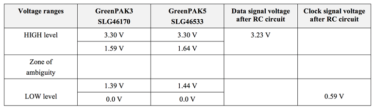 V DD = 3.3 V的電壓下,RC元件之后的輸出電壓將為out = 0.181269·3.3 V≈0.59 V,因此時(shí)鐘脈沖將不會(huì)通過RC元件。為了進(jìn)行檢查,讓我們將獲得的合成信號(hào)電壓電平與特征邏輯/電壓電平進(jìn)行比較。針對(duì)電源電壓為VDD 0 = 3.3 V的情況進(jìn)行該比較(圖5