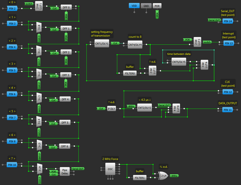 CNT1計(jì)數(shù)器定義了傳輸信號(hào)時(shí)間(如前所述,設(shè)置為?5 μs)。CNT4計(jì)數(shù)器形成八個(gè)這樣的時(shí)間段的數(shù)據(jù)包,并使用2LUT3反相器控制2LUT13LUT0÷3LUT53LUT9多路復(fù)用器。當(dāng)來自2LUT3反相器輸出的內(nèi)部開關(guān)信號(hào)為低電平時(shí)(圖7中斷信號(hào)),則通過多路復(fù)用器記錄來自輸入PIN8,#10的信息執(zhí)行相應(yīng)的觸發(fā)器。然后,當(dāng)“ switch”中斷信號(hào))信號(hào)變高時(shí),觸發(fā)器上的數(shù)據(jù)發(fā)生移位,并形成一個(gè)串行代碼(圖7“ Serial_OUT”信號(hào))