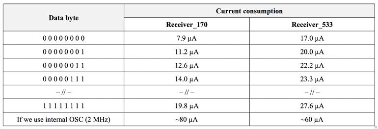 測(cè)得的電流值表明Receiver_533電路芯片消耗的電流略高于Receiver_170電路的電流。這是因?yàn)橛捎谑褂昧烁郊拥妮o助服務(wù)位S1S0Receiver_533電路中的傳輸信號(hào)要長(zhǎng)兩位。因此,可以總結(jié)出,帶有RC元件的芯片所消耗的電流遠(yuǎn)小于帶有OSC 2 MHz振蕩器的芯片所消耗的電流。