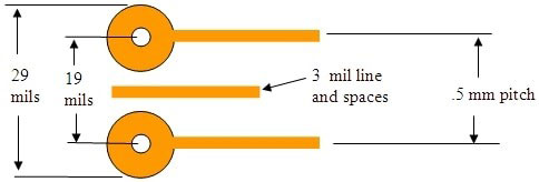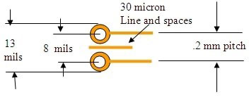 使用新的微電路設計技術代替常規的印刷電路技術可節省大量的空間。如今,典型的75微米線寬的最佳間距約為.5mm,通過75微米線和250微米(10mils)的焊盤可得到75微米(3mils)。墊片之間的間距為225微米(9mils),墊片之間僅允許一條75微米的線,對于大多數商店來說,這種最小規格是很難的。