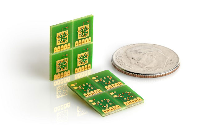 當我們生產第一個微型PCB時,我們注意到的第一件事是通孔在焊盤中居中。該設計使用了9mils的焊盤和3mils的通孔,對于傳統的印刷電路工程來說,該通孔是緊的。新的更精確的激光制造方法將允許小至5mils的焊盤和3mils的通孔,從而節省了大量的電路板面積。