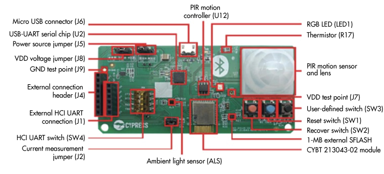 圖4顯示了可用于產品原型設計和開發的評估板示例。請注意,其中包括了智能照明應用中通常需要的三個功能:用于照明設備的LED,開關以及用于占用傳感器的PIR運動檢測器。電路板底部邊緣中心的模塊包含BLE Mesh網絡以及運行應用程序軟件所需的CPU,內存和天線。