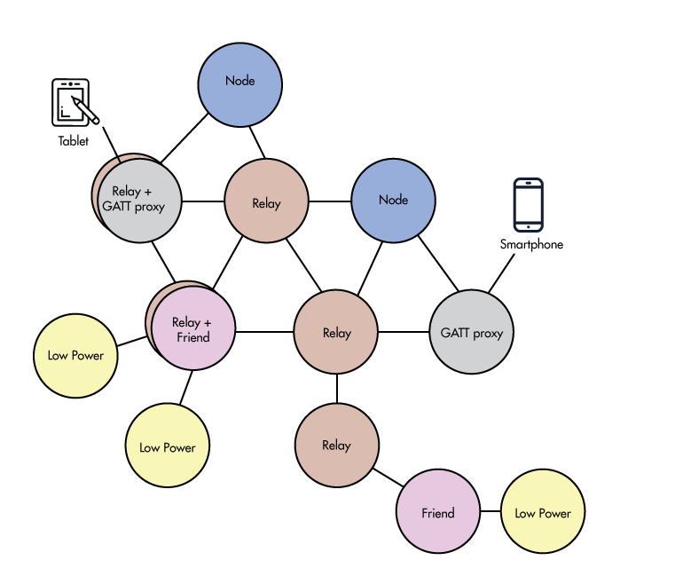 可擴展拓撲使BLE Mesh網絡理論上最多支持32,767個節點,這個數目對實際應用沒有實際限制。該標準定義了四種類型的節點,并且可以將任何單個節點配置為支持多種類型: