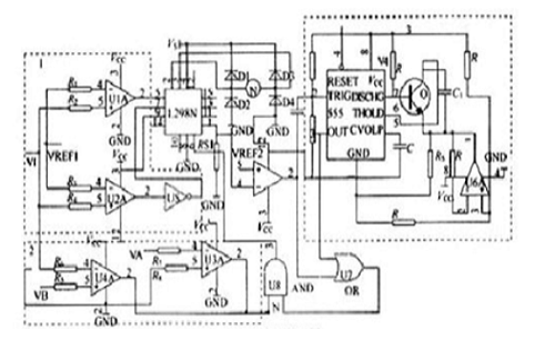 (2)在虛線2的框圖中,兩個比較器U3A和U4A形成雙極限比較器。當VB<vi<va, the="" output="" is="" low.="" when="" vi=""> <vb, the="" output="" is="" high.="" va,="" vb="" upper="" and="" lower="" limits="" of="" <="" span="">爐壓力傳感器轉換的電壓,即反應堆主體的壓力控制范圍。根據過程要求,我們可以指定值只要爐子的壓力在VA和VB之間,就可以達到VA和VB的水平。電機停止(注意VB<vrbf1<va, if="" it="" is="" not="" within="" this="" range,="" <="" span="">系統不穩定)。