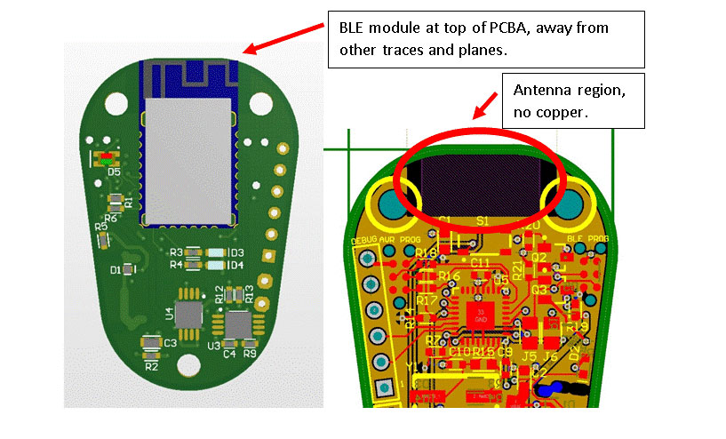 3.在藍牙芯片組或模塊中進行電路設計時,請使天線區域完全遠離附近的銅信號或承載大量能量的組件(尤其是經過升壓或降壓轉換器切換的電源路徑)。
