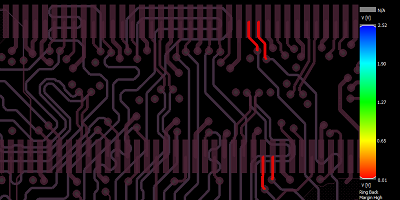 首先,選擇“反射工作流”和要檢查的網絡。選擇網絡后,單擊“開始分析”以開始仿真。模擬器完成后,您可以單擊“反射視覺”以查看熱圖,該熱圖標記選定網絡中反射的位置。您也可以單擊反射表以查看特定的過沖/下沖值及其在面板中的坐標。由于我們正在處理此板上的DDR線,因此可以將這些值與反射表中的JEDEC規范進行比較。