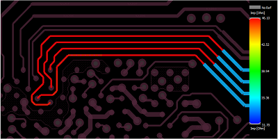 要檢查阻抗變化,請在分析工具欄中選擇“阻抗工作流程”選項。選擇相同的網絡以分析并運行仿真。可以通過選擇“阻抗視覺”選項來查看整個互連的阻抗,該選項將再次顯示帶有顏色編碼阻抗值的熱圖。