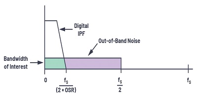 過采樣在本質(zhì)上與集成的數(shù)字濾波器和抽取功能一起使用和實(shí)現(xiàn)。Σ-ΔADC中的基本過采樣調(diào)制器對(duì)量化噪聲進(jìn)行整形,以使其大部分出現(xiàn)在目標(biāo)帶寬之外,從而導(dǎo)致低頻處的整體動(dòng)態(tài)范圍增加,如圖4所示。數(shù)字低通濾波器(LPF) )然后去除感興趣帶寬之外的量化噪聲,抽取器將輸出數(shù)據(jù)速率降低回奈奎斯特速率。