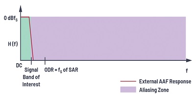如果選擇400 kSPS的采樣速度來放寬濾波器的階數(shù),則對(duì)于> 300 kHz的輸入頻率,則需要抑制。增加采樣速度將增加功率,對(duì)于雙倍速度,功率也將增加一倍。由于采樣頻率遠(yuǎn)高于輸入帶寬,因此,以功率為代價(jià)的進(jìn)一步過采樣將進(jìn)一步放寬抗混疊濾波器的要求。