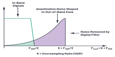 在理想的Nyquist ADC中,ADC的LSB大小將確定在進(jìn)行模數(shù)轉(zhuǎn)換時(shí)添加到輸入的量化噪聲。該量化噪聲分布在fS / 2的帶寬上。為了對(duì)抗量化噪聲,第一種技術(shù)是過采樣,即以比奈奎斯特頻率高得多的速率采樣輸入信號(hào),以提高信噪比(SNR)和分辨率(ENOB)。在過采樣中,采樣頻率選擇為Nyquist頻率(2×fIN)的N倍,結(jié)果,現(xiàn)在相同的量化噪聲必須在N倍Nyquist頻率上擴(kuò)展。這也放寬了對(duì)抗混疊濾波器的要求。過采樣率(OSR)定義為fS / 2fIN,其中fIN是感興趣的信號(hào)BW。作為一般準(zhǔn)則,對(duì)ADC進(jìn)行四倍的過采樣可提供額外的分辨率,或動(dòng)態(tài)范圍增加6 dB。增加過采樣率將導(dǎo)致整體噪聲降低,并且由于過采樣而導(dǎo)致的動(dòng)態(tài)范圍(DR)改善為ΔDR= 10log10 OSR,以dB為單位。
