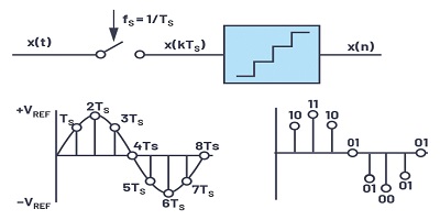 數(shù)據(jù)的數(shù)字化涉及采樣和量化的兩個(gè)基本過程,如圖1所示。采樣是第一步,其中使用采樣將連續(xù)時(shí)間變化的模擬信號(hào)x(t)轉(zhuǎn)換為離散時(shí)間信號(hào)x(n)。頻率fS。結(jié)果平均間隔為1 / TS(fS = 1 / TS)。