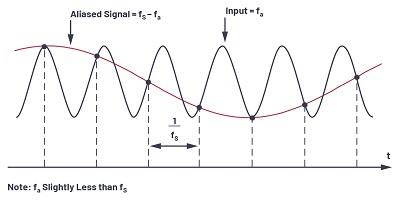 為了理解混疊在時(shí)域和頻域中的含義,首先考慮如圖2所示采樣的單音正弦波的時(shí)域表示形式。在此示例中,采樣頻率fS不至少2fa,但僅略高于模擬輸入頻率fa,因此無法滿足奈奎斯特標(biāo)準(zhǔn)。請(qǐng)注意,實(shí)際樣本的模式會(huì)在等于fS – fa的較低頻率下產(chǎn)生混疊正弦波。
