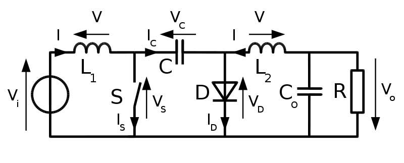 該轉(zhuǎn)換器由加州理工學(xué)院的Slobodan?uk教授設(shè)計(jì),由兩個(gè)電感器,兩個(gè)電容器,一個(gè)二極管和一個(gè)開(kāi)關(guān)元件構(gòu)成。它可以升高和降低施加到其輸入端子的電壓。?uk轉(zhuǎn)換器的輸出具有與輸入電壓相反的極性。它還能夠在不連續(xù)電壓模式下運(yùn)行。這是在換向周期內(nèi)耦合電容器兩端的電壓降至零時(shí)的情況。附帶地,耦合電容器的存在降低了EMI輻射。