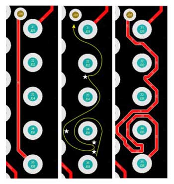 組件的放置和布線是PCB設計工具提供的原始功能,而這些功能對于當今的設計師仍然至關重要。當今先進的設計工具通過交互式布線來沿光標路徑放置布線部分,實現在障礙物上推動或行走,并自動跟隨現有連接,從而幫助較大化布線效率和靈活性。光標引導的布線使圍繞障礙物的復雜手動布線變得快速,輕松和直觀。用鼠標創建路徑,交互式布線器會嘗試根據該路徑放置軌道。圖1顯示了如何在光標移動引導的情況下快速創建復雜的路線。左圖顯示了一條正常的最小長度的路線,中圖顯示了光標路徑,星號表示單擊位置以提交路線的各個部分。正確的圖像是最終的布線。盡管是一個極端的示例,但它顯示了放置多個軌道所需的布線提交數量。