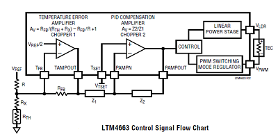 LTM4663模塊基于Peltier效應針對熱電冷卻/加熱子系統,提供了實現溫度控制環路以實現精確熱穩定所需的功能。