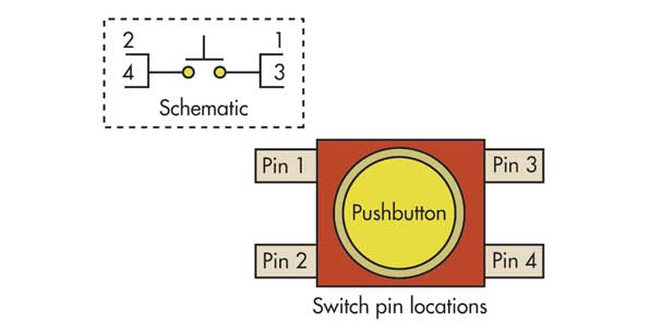 盡管現代組件已變得萬無一失,但研究PCB設計中計劃的組件以很大程度地減小對端板構建的影響仍然很重要。有些組件的包裝細節不明顯。盡管許多IC和分立元件都有標準封裝,但某些封裝具有特殊的屬性,使它們容易受到焊接錯誤和其他組裝錯誤的影響,例如非標準的引腳焊盤幾何形狀或分配。例如,在圖5中,瞬時按鈕開關乍一看將使針腳1和2短路在一起,而針腳3和4基于每對針腳的接近程度短路。但是數據表中的器件原理圖表明實際上已連接了其他引腳。